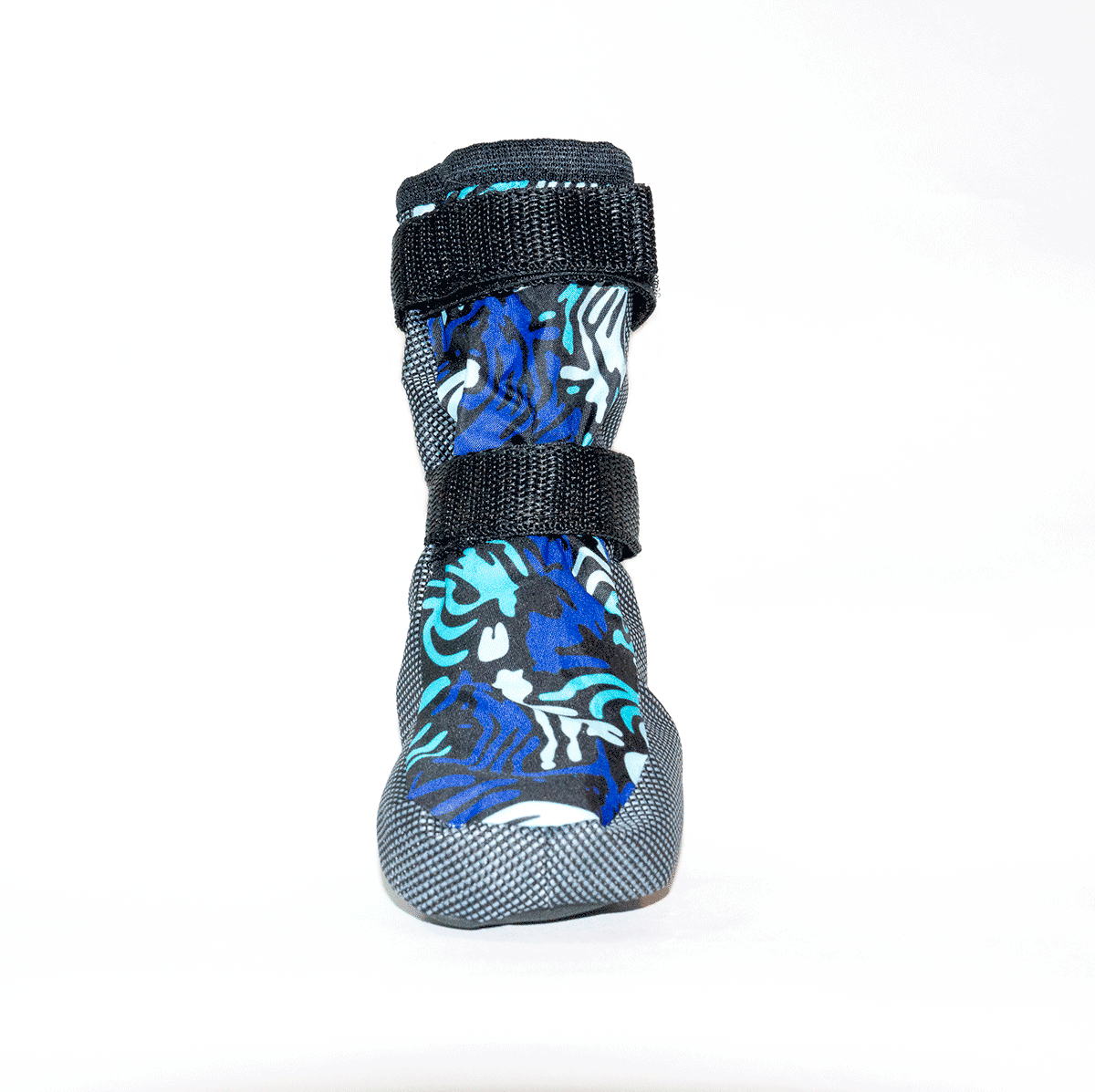 Изготовлены из прочного износостойкого синтетического материала Оксфорд 1680 с водоотталкивающей пропиткой. Имеют подкладку из флиса. Подошва выполнена из нескользящего Оксфорда 600. Ботинок на лапе фиксируется с помощью двух липучек – которые позволяют надежно зафиксировать ботинок на лапе. Предназначены для ношения в холодную грязную погоду и для защиты лап собаки от соли и реагентов.