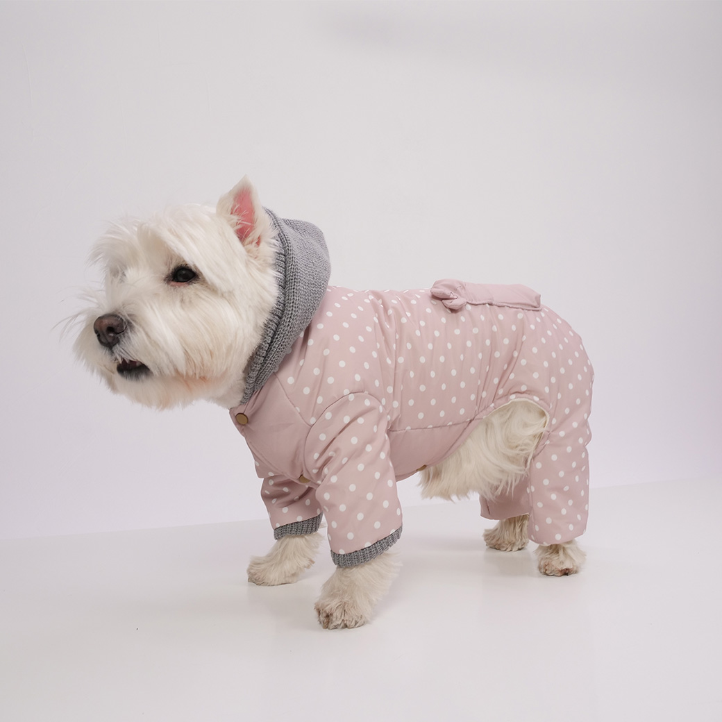Милый и легкий комбинезон для ваших любимиц "Горошки". Выполнен из непромокаемой болони, утеплен синтепоном - подкладка - трикотаж. Стильный вязаный капюшон пристегивается кнопкой к спинке, украшен кармашком. Застегивается на животике на клепочки. |