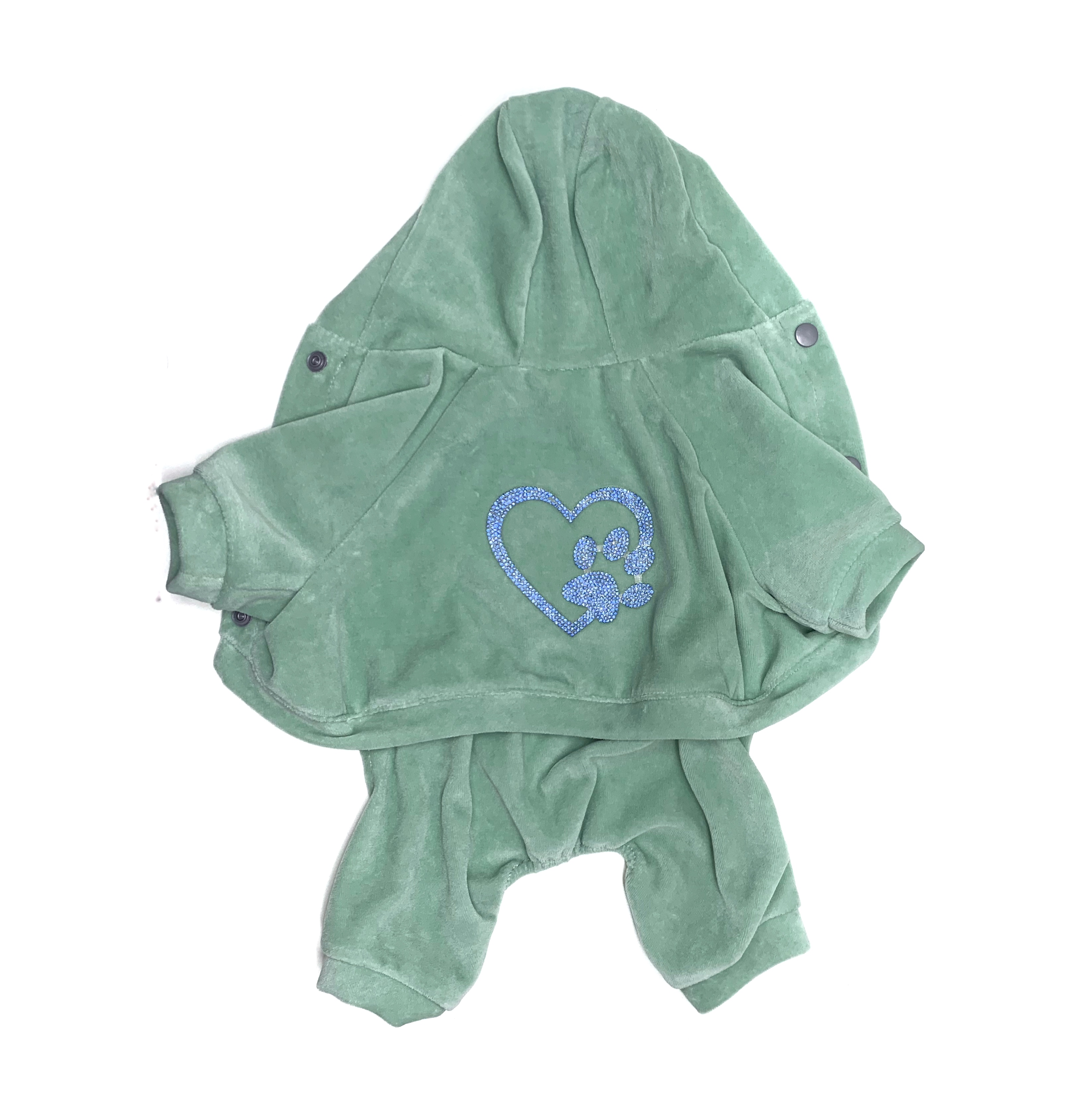 Мягкий и удобный велюровый костюмчик для ваших либимцев и любимиц "Heart". На спинке красивая аппликация из страз в форме сердечка и лапки. Застегивается на животике на клепочки. Выполнен из качественного хлопкового велюра. |
