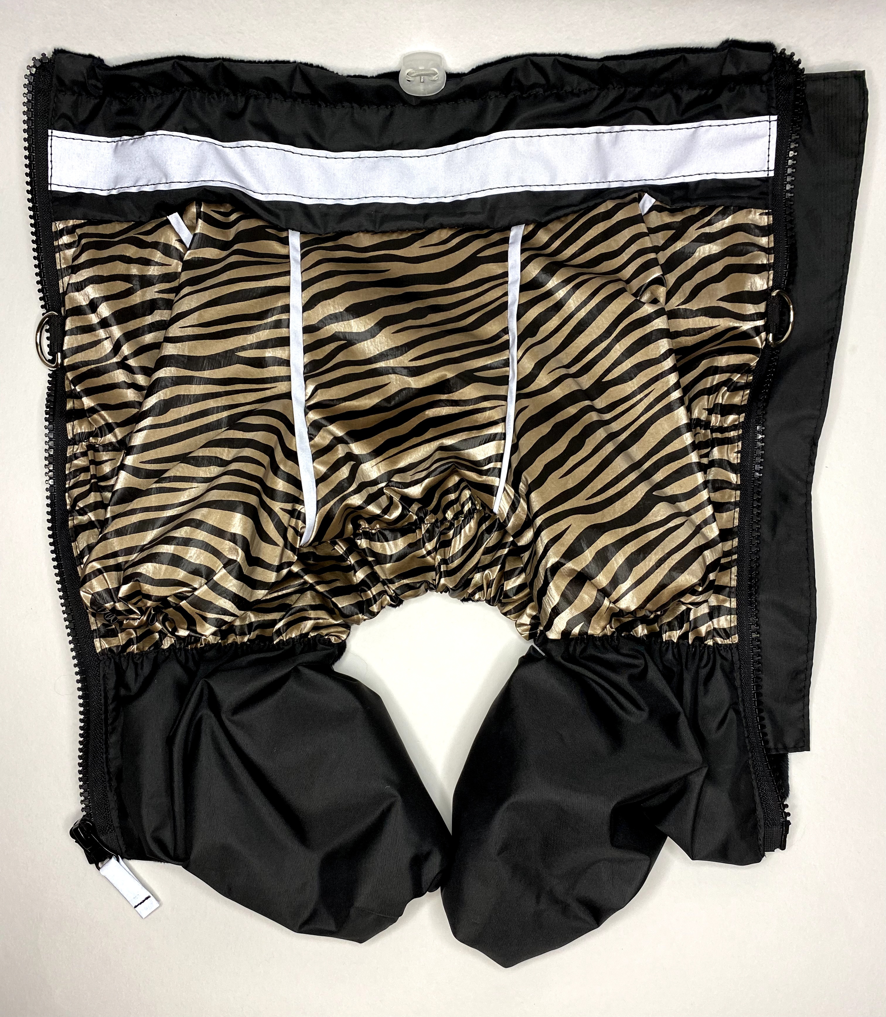 Яркий комбинезон с животным принтом прекрасно подойдет для переходной погоды между зимой и весной. Верхняя ткань не промокает, подкладочка - мягкий и теплый вельбоа. Застегивается на спинке на молнию и имеет вставочку, которая защищает шерсть от попадания в молнию. Ширина воротника регулируется кулисой и декорирована светоотражающей полоской. На спинке кольца для крепления поводка. Модель унисекс. |