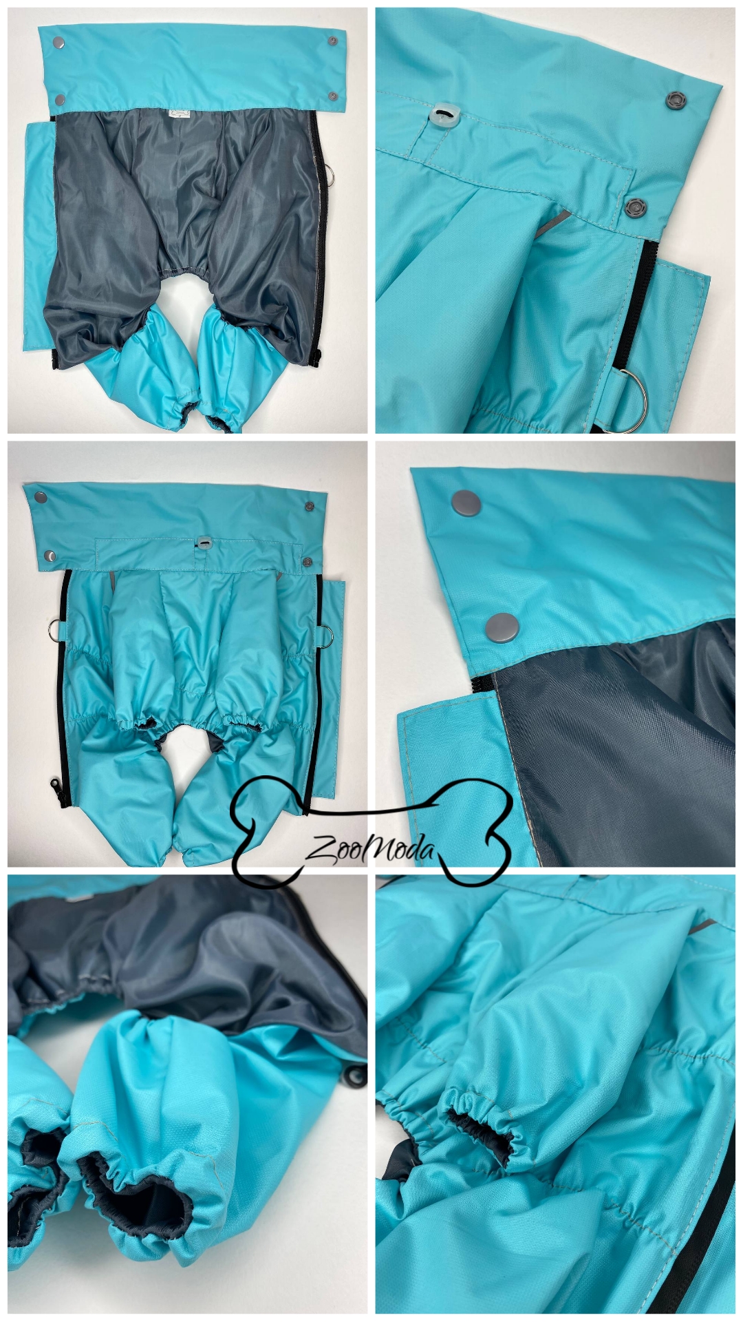 1. Материалы высокого качества: Дождевик выполнен из непромокаемой мембранной ткани яркого голубого цвета, что делает его не только функциональным, но и стильным акцентом.