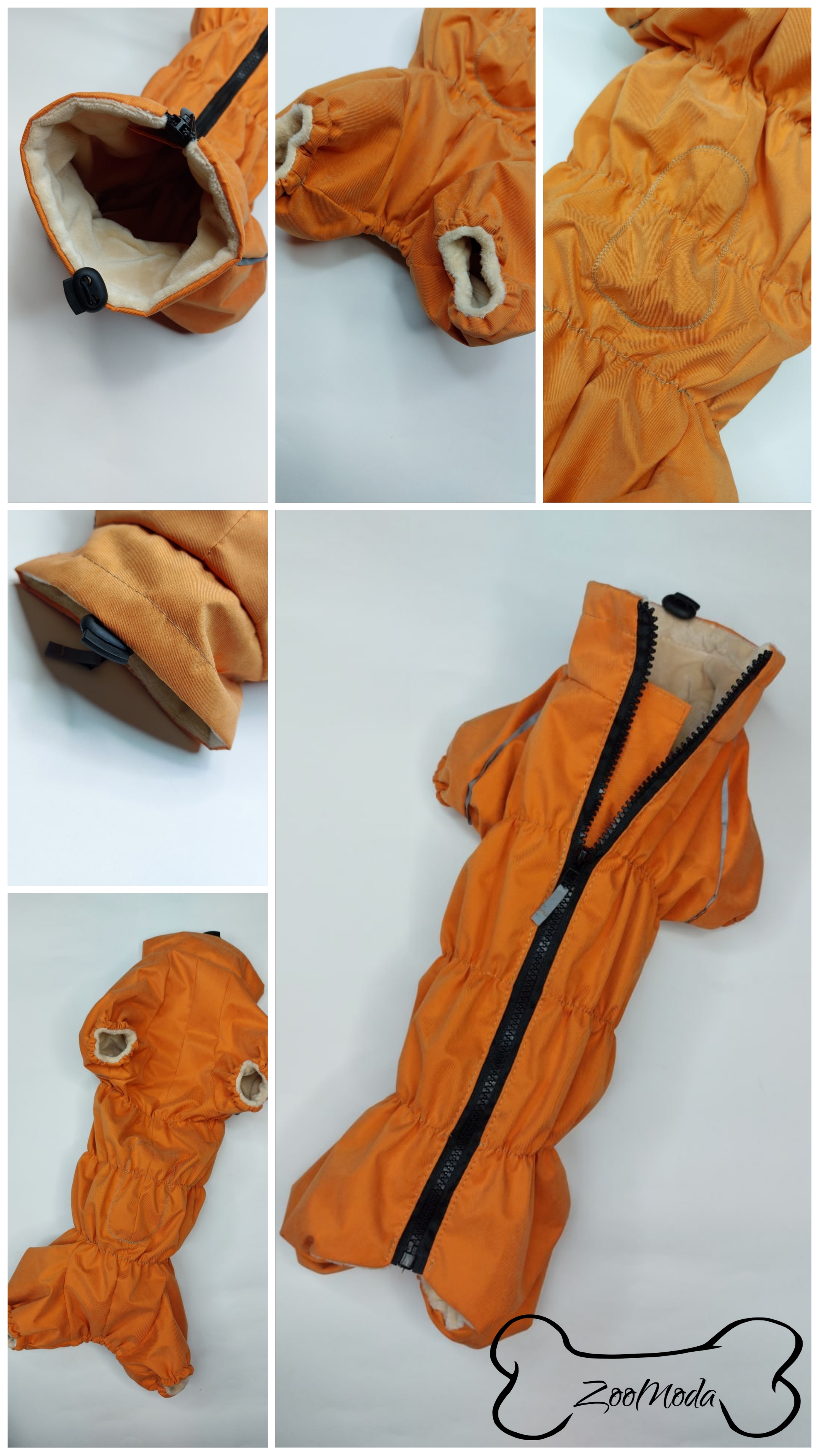Комбинезон для таксы, выполненный из рыжей мембранной ткани с меховой подкладкой из вельбоа. Он предназначен для холодной погоды, так как вельбоа обеспечивает тепло и комфорт. Застежка — молния, расположенная на спинке, что облегчает процесс надевания и снятия. У модели укороченные лапки, что позволяет таксе двигаться свободно и комфортно. Универсальный дизайн делает комбинезон подходящим как для мальчиков так и для девочек.