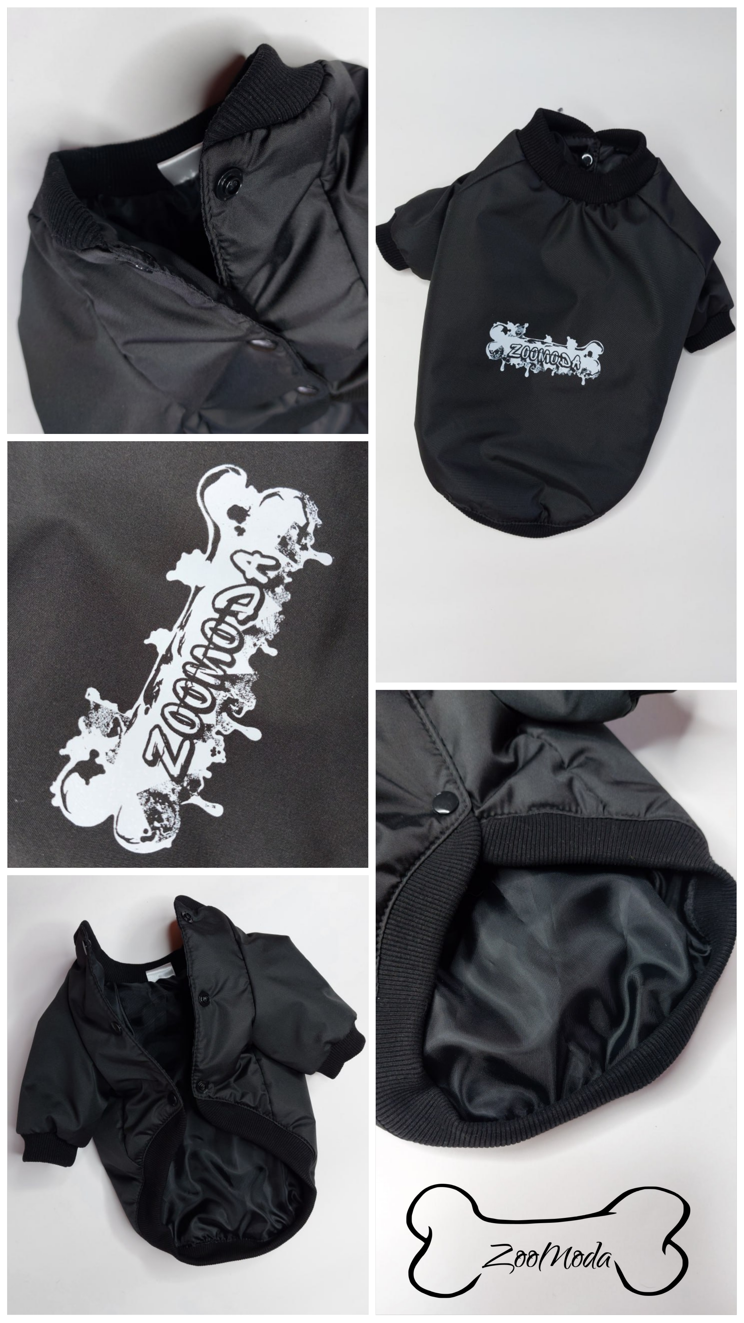Выполнен в черном цвете из легкой и прочной ткани, бомбер дополнен эффектным белым принтом в виде косточки с логотипом "ZooModa" на спине. Внутренняя подкладка из гладкого материала обеспечивает комфорт, а манжеты на рукавах и воротнике выполнены из мягкой резинки для плотного прилегания. Застегивается на удобные кнопки, что делает его практичным и простым в использовании.